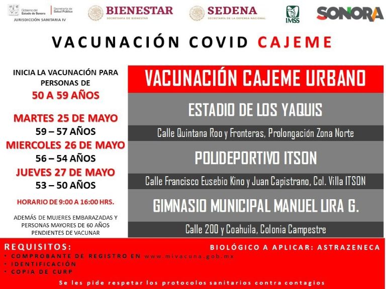 Ciudad Obregón, Sonora.- Gran expectativa fue la que generó el inicio de la jornada de vacunación contra Covid-19 para personas con edades entre los 50 y 59 en Cajeme, por lo que la mañana de este martes 25 de mayo, una gran afluencia se vivió en los puntos establecidos para ese fin.