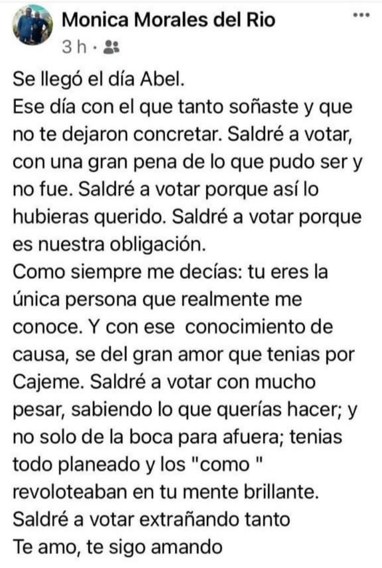 Su esposa Mónica Morales, compañera de los buenos momentos, los no tan buenos y los muy buenos también utiliza sus redes para darse fuerza, para vivir un día a la vez. “Se llegó el día Abel. Ese que tanto soñaste que no te dejaron concretar. Saldré a votar, con la gran pena de lo que pudo ser y no fue. Saldré a votar porque así lo hubieras querido. Saldré a votar porque es nuestra obligación. Como siempre me decías: tú eres la única persona que realmente me conoce. Y con ese sentimiento de causa sé el gran amor que tenías por Cajeme”.