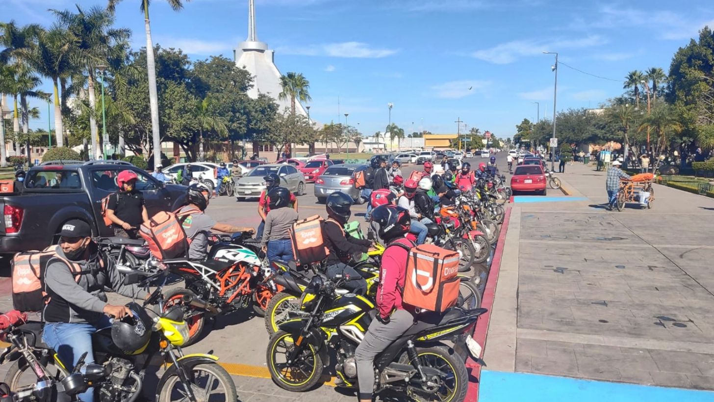 Ciudad Obregón, Sonora.- Denunciando falta de acciones de seguridad que garanticen las labores de trabajo, cerca de 80 repartidores de comida de diferentes aplicaciones se manifestaron frente a Palacio Municipal de Ciudad Obregón, cerca de las 11:00 horas.