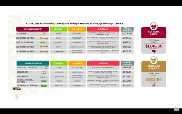 “Esta semana se pasó de rosca nos fueron a ver la semana pasada para platicarnos que hicieron un cambio de políticas de preciación, otra forma de poner sus precios, pero más bien nos fueron a avisar que se pasarían de rosca con los consumidores que quieran ir ahí. Soriana salió arriba de las tablas en todo, en todo el país; en la zona centro, quién es el más carero, Coyoacán Soriana, mil 16 pesos, y también se pasaron de rosca en la Venustiano Carranza; en la Miguel Hidalgo; en Santiago Querétaro, son los precios más altos Soriana, rompió récord para mal”, informó el funcionario.