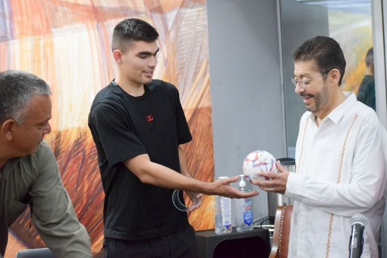 Navojoa, Sonora.- Como un navojoense distinguido fue galardonado el futbolista Johan Vásquez, recibiendo un reconocimiento por parte del presidente municipal Mario Martínez Bojórquez. El actual futbolista del U.S. Cremonese de la Serie A de Italia ha tenido una trayectoria destacada en los últimos años, obteniendo la medalla de bronce en los Juegos Olímpicos de Tokio 2020 y un buenas actuaciones con el Genoa, al cual emigró procedente del balompié mexicano.