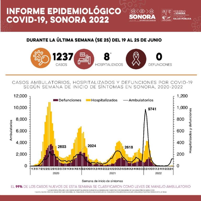 Hermosillo, Sonora.- Un aumento de poco más del doble de contagios por Covid-19 reportó la Secretaría de Salud en Sonora la semana epidemiológica 25, que abarca del 19 al 25 de junio, luego de que se registraran mil 237 casos por el virus, ninguna defunción y ocho hospitalizados por la misma causa. La dependencia compartió sus datos preliminares con relación a dicho rubro, siendo el municipio de Hermosillo el que mayor número de infectados presentó, con 514 pacientes.