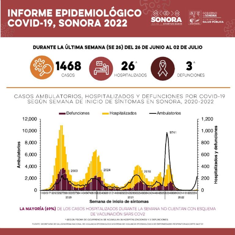 Hermosillo, Sonora.- Este lunes 5 de julio, la Secretaría de Salud confirmó que en Sonora se han presentado mil 468 contagios por Covid-19, así como tres fallecidos y 26 pacientes hospitalizados por la misma causa, esto en la semana que comprende del 26 de junio al 2 de julio del 2022. De los casos positivos, 904 son mujeres y 564, hombres; mientras que de las personas que fueron internadas, el 69 por ciento no cuenta con su esquema de vacunación contra el coronavirus.