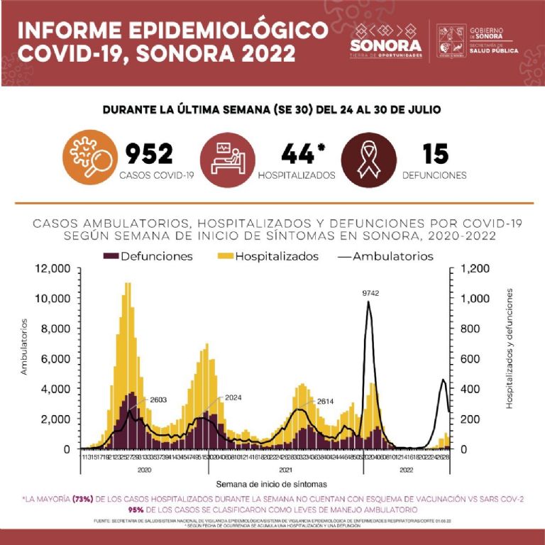 Hermosillo, Sonora.- La semana epidemiológica 30, que abarca del 24 al 30 de julio de 2022, la Secretaría de Salud reportó 952 casos de Covid-19 y 15 defunciones a causa de la enfermedad, además de 44 personas hospitalizadas por la misma razón. De acuerdo con los datos preliminares de la dependencia estatal, los municipios que más contagios registraron son Hermosillo (339), Nogales (213), Cajeme (93), Caborca (77) y San Luis Río Colorado (48).