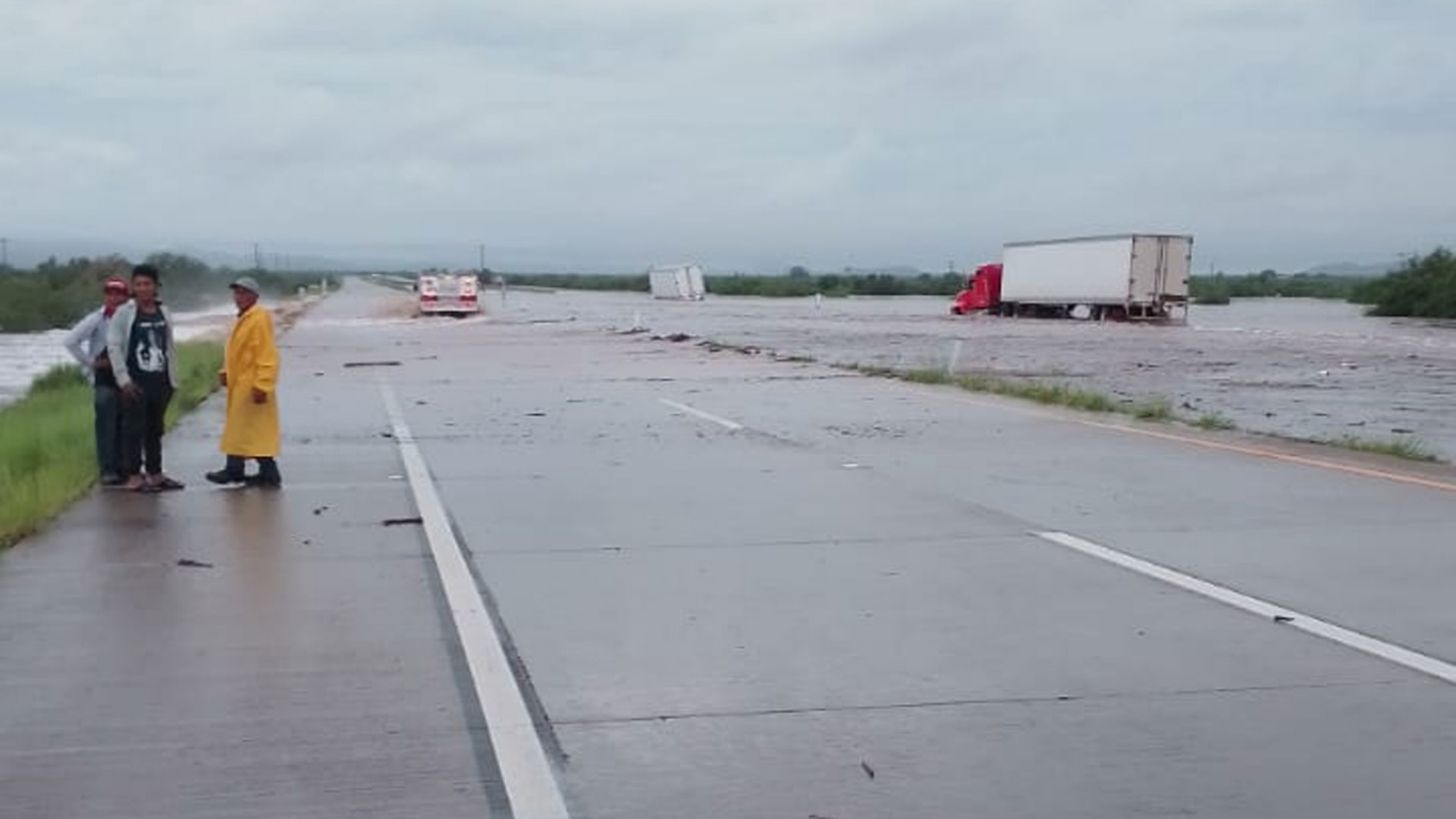 Protección Civil Sonora atiende en este momento un reporte por inundación en el libramiento Guaymas-Obregón a la altura de la caseta de cobro, en donde elementos de Caminos y Puentes Federales (Capufe) y Guardia Nacional, rescataron a dos personas que quedaron varadas en un camión de carga", detalló la dependencia