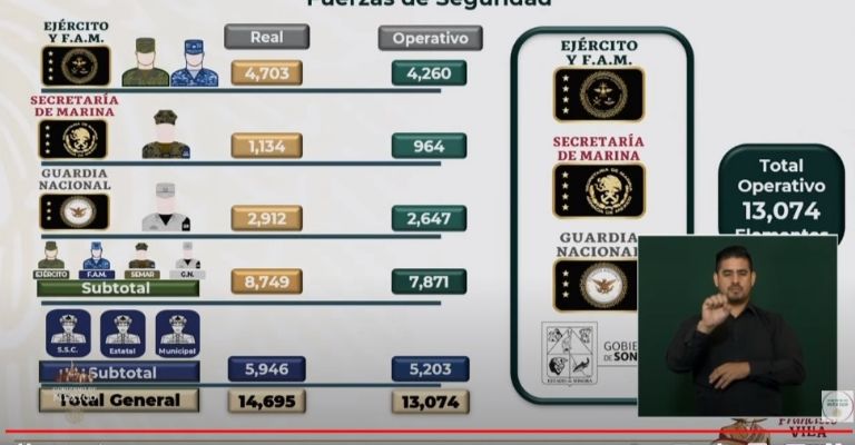Cresencio Sandoval señaló que Sonora cuenta con siete mil 871 elementos operativos de fuerzas federales de seguridad, entre los cuales se ubican a dos mil 647 de Guardia Nacional, 964 de Marina y cuatro mil 260 del Ejército y Fuerza Aérea.