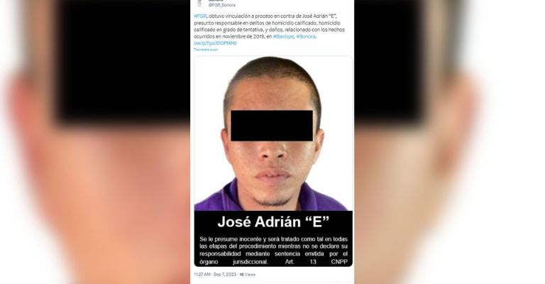 Bavispe, Sonora.- Durante la mañana de este jueves 7 de septiembre, se logró la vinculación a proceso de José Adrián 'N', presunto responsable en delitos de homicidio calificado en contra de la familia LeBarón, esto durante el pasado 4 de noviembre de 2019, donde desafortunadamente nueve personas perdieron la vida, entre las cuales se encuentran tres bebés de ocho meses y dos años de edad.