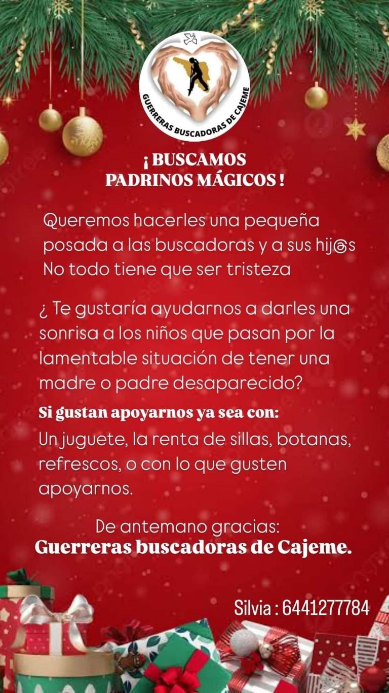 Ciudad Obregón, Sonora.- Con la finalidad de brindar un momento de felicidad durante esta época de celebraciones de paz y unión, el colectivo Guerreras Buscadoras de Cajeme, solicitó el apoyo de la ciudadanía para realizar una posada para los niños con padres desaparecidos.