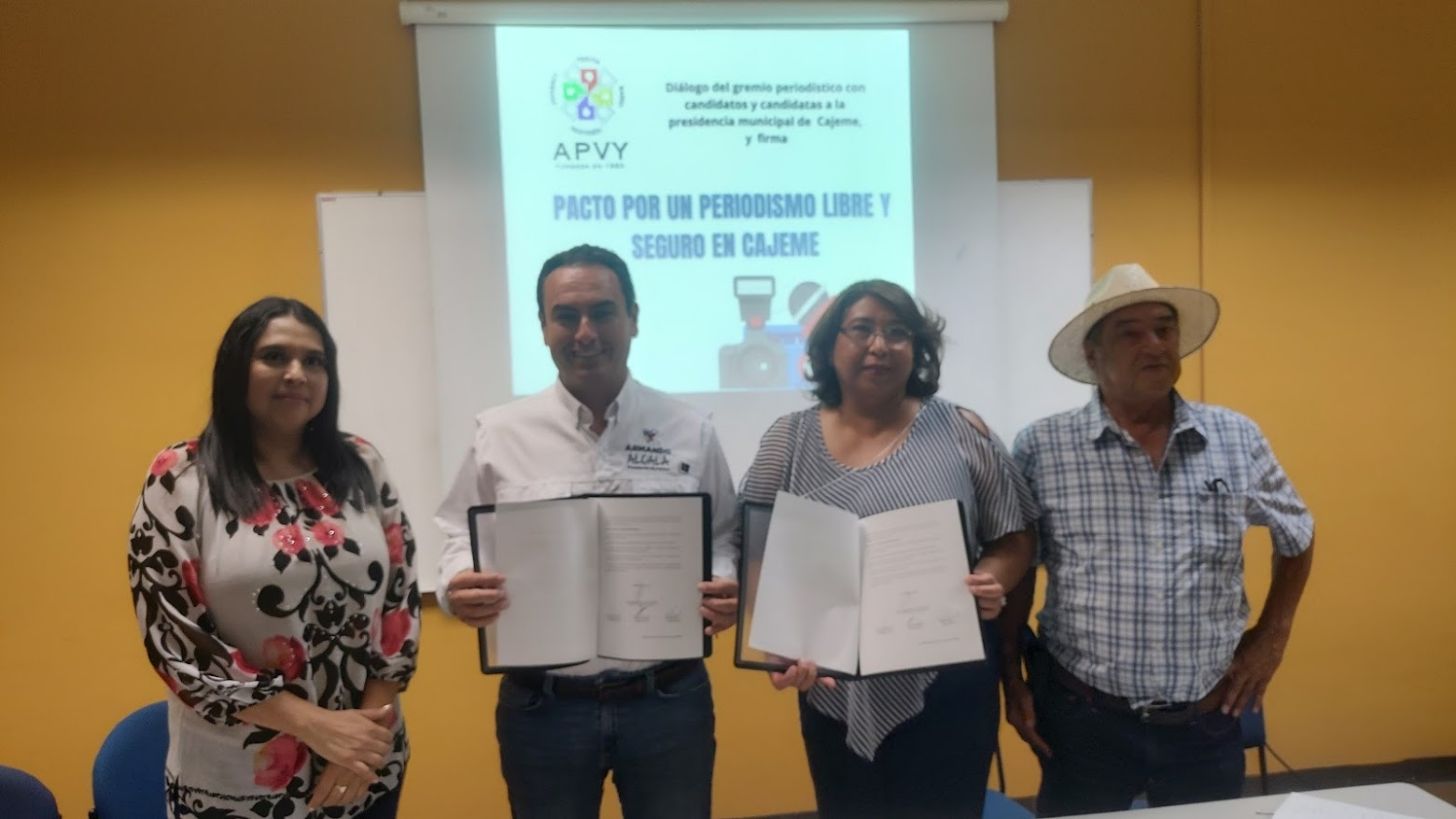 Cajeme, Sonora. - En busca de acuerdos que permitan alcanzar una mejor relación entre gobernantes y representantes de los diferentes medios de comunicación, y garantizar la libertad de expresión, el candidato a la alcaldía Armando Alcalá signó ayer el ‘Pacto por un Periodismo Libre y Seguro en Cajeme’, presentado por la Asociación de Periodistas del Valle del Yaqui (APVY) a los cuatro aspirantes a la alcaldía de Cajeme.