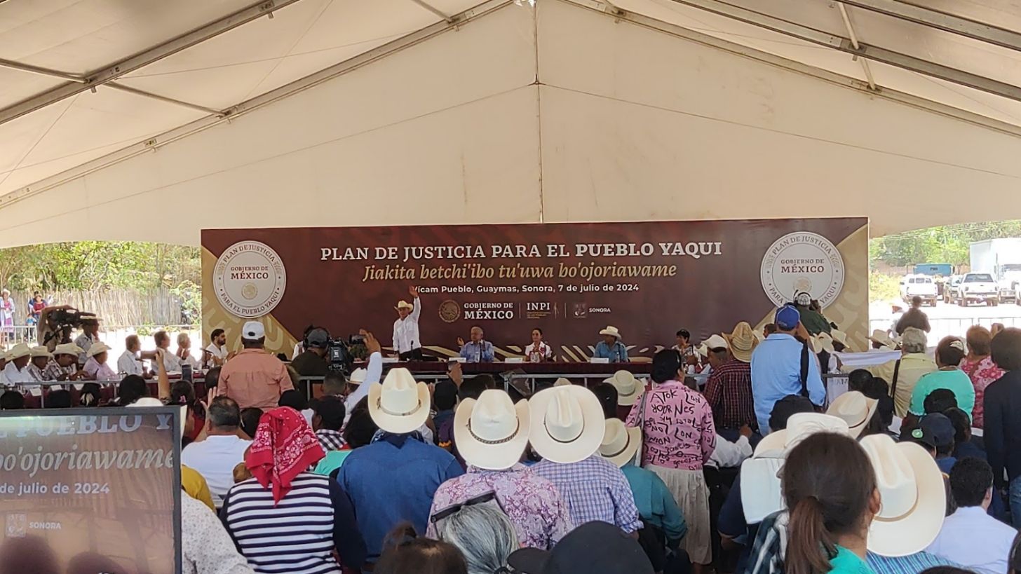 Vícam, Sonora.- A casi tres años de aquel 28 de septiembre de 2021, cuando Andrés Manuel López Obrador puso en marcha el Plan de Justicia del Pueblo Yaqui, ayer en ese mismo lugar, Vícam Pueblo, la etnia pidió a la virtual presidenta electa dar continuación asegurando que un sexenio no alcanza para resarcir el daño hecho a la tribu.