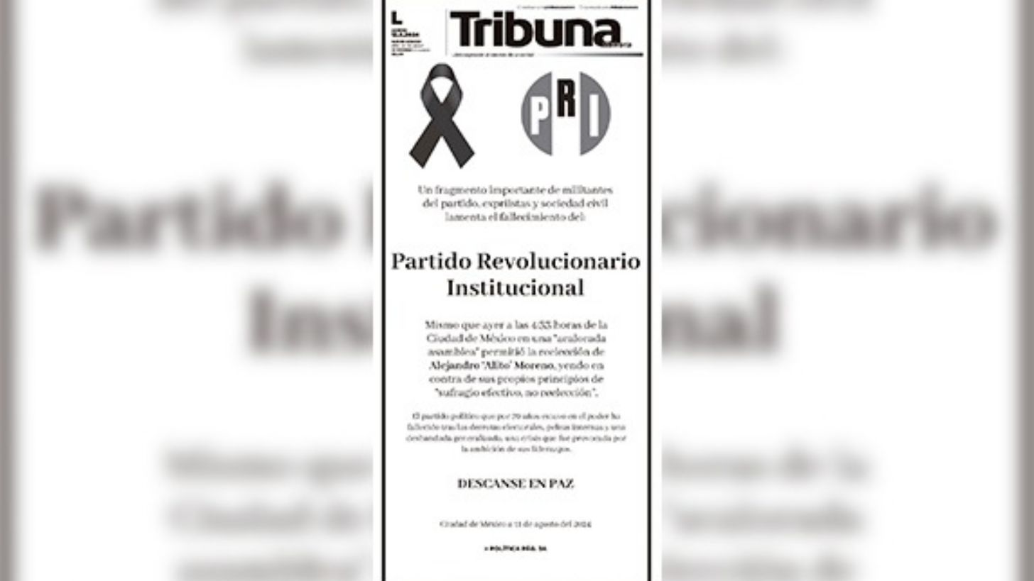 Ciudad Obregón, Sonora.- Hoy el periódico TRIBUNA Sonora lanza una portada en forma de esquela tras la reelección de Alejandro ‘Alito’ Moreno Cárdenas frente al Partido Revolucionario Institucional (PRI), la institución política que alguna vez tuvo todo el poder murió tras traicionar su principal principio "sufragio efectivo, no reelección".