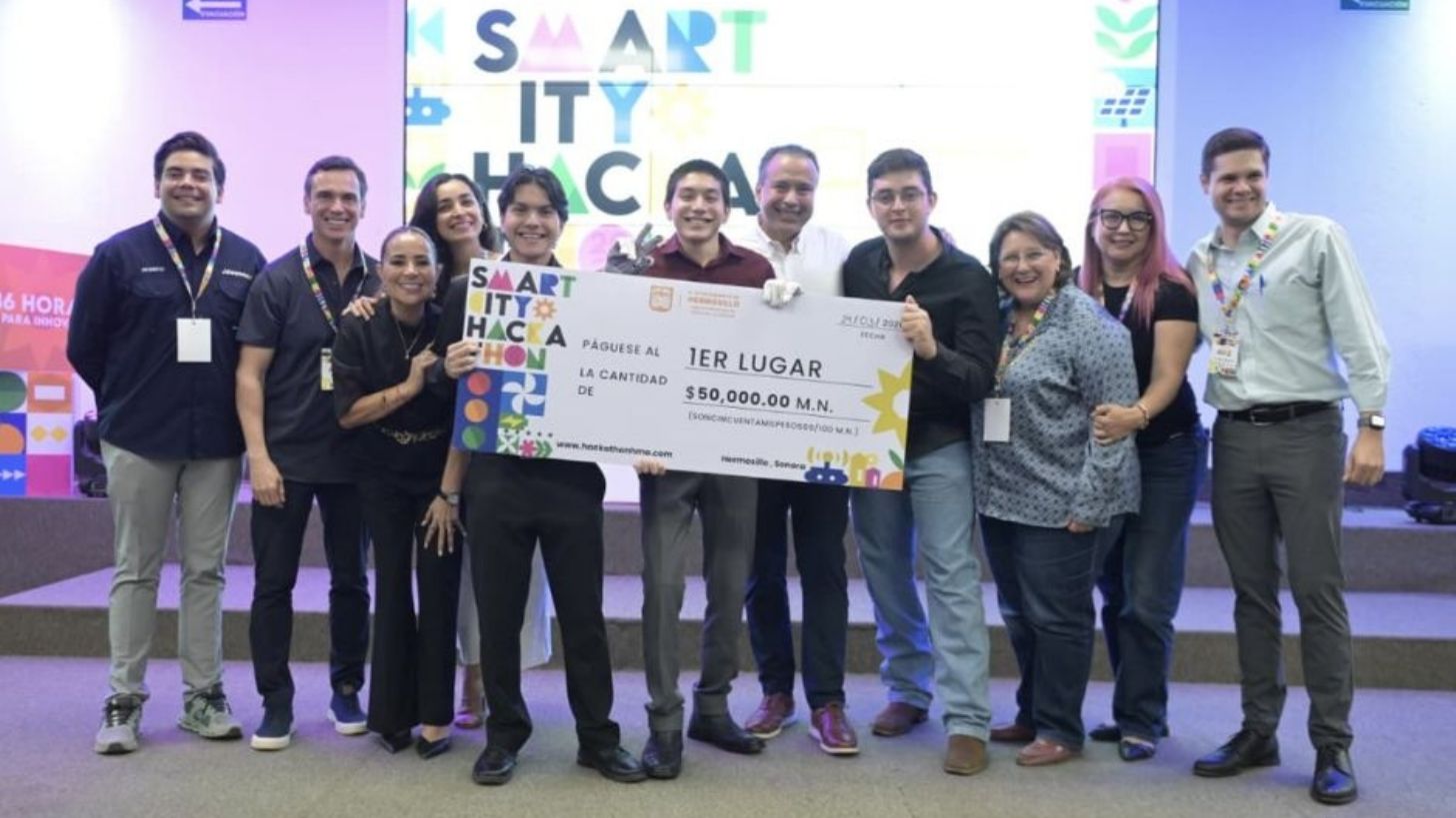 Hermosillo, Sonora.- El proyecto Señas a Voces, un dispositivo que traduce la Lengua de Señas Mexicana a mensajes de voz mediante una computadora, obtuvo el primer lugar en la final del Smart City Hackathon 2026, encabezado por el presidente municipal Antonio Astiazarán Gutiérrez.