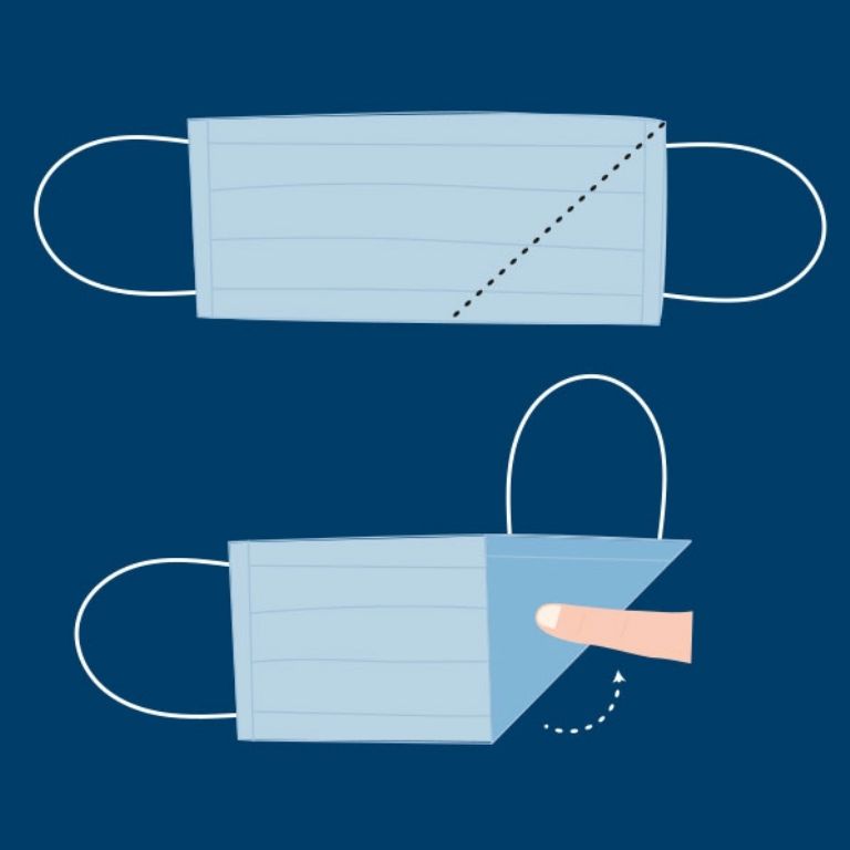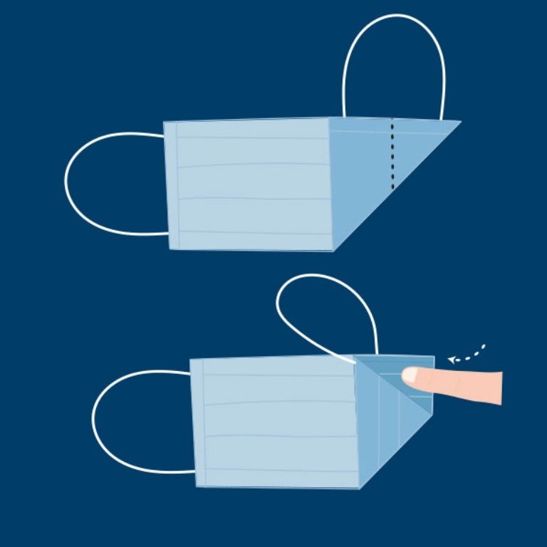 Agarra la esquina y separa la mascarilla, se hará un pliegue que doblarás en si mismo y coloca la punta del pliegue encima de las otras dos esquinas, sujétalo con un hilo o una grapa