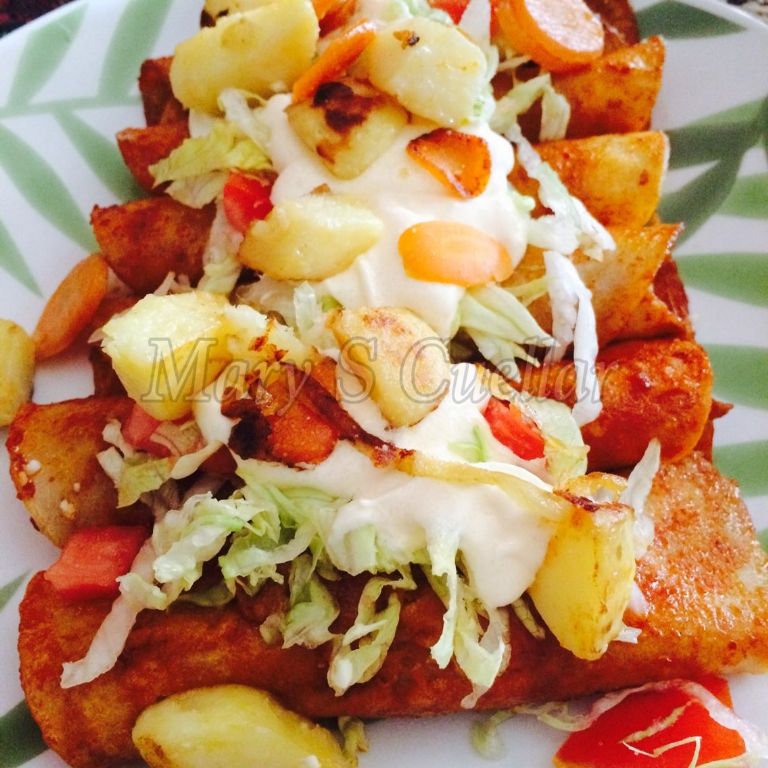 Se trata de unos tacos fritos con salsa de chile guajillo, rellenos de queso, en la superficie tiene papa, zanahoria, chorizo, lechuga y algunos le ponen crema. Este platillo también es muy tradicional en Michoacán.