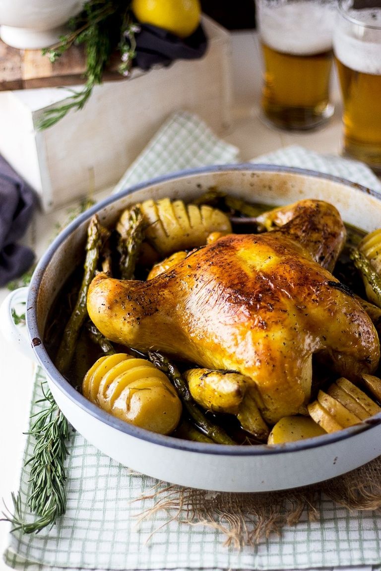 - Permite que todo se hornee durante 30 minutos, procura darle de vueltas las piezas de pollo para que no se sequen y se bañen con los jugos de la cerveza y las especias.