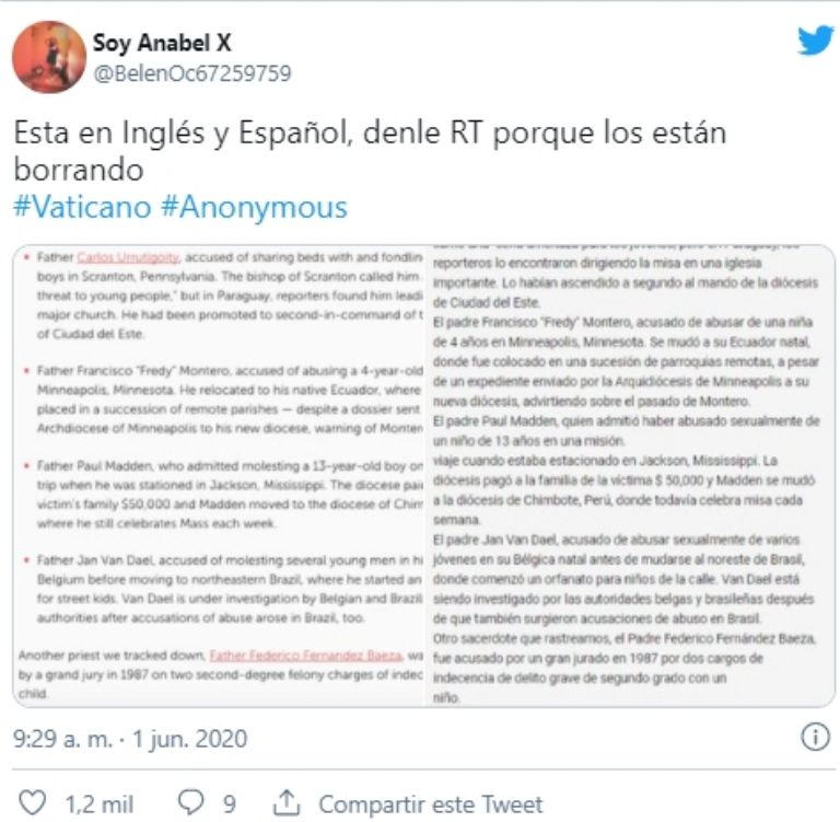 - Vaticano: En mayo del año pasado, los cibernautas detectaron que la organización informática que usa máscaras de Guy Fawkes intervino en el sistema de datos de la Santa Sede, sin embargo, los responsables de manejarla actuaron con celeridad y borraron las publicaciones que dejaban al descubierto el nombre de sacerdotes que cayeron en abuso sexual.