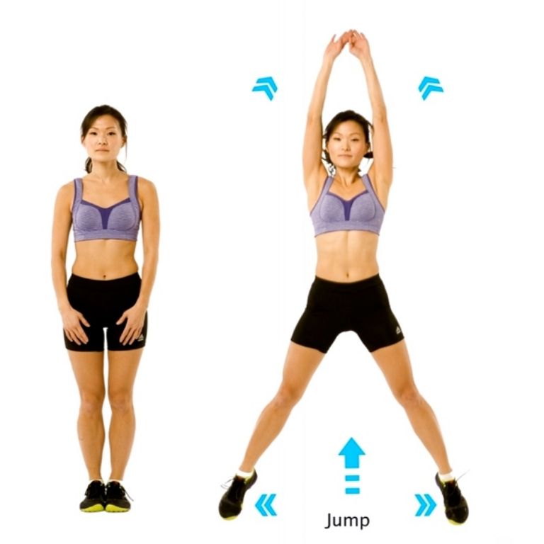 Debes estar de pie mientras estás parada derecha, luego tienes que brincar y al mismo tiempo abrir las piernas, mientras estiras las manos, continúa así durante 30 segundos, notarás que comienzas a sudar demasiado y que el trabajo de cardio comienza a hacerse.