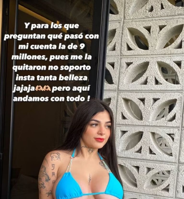 Y para los que preguntan qué pasó con mi cuenta la de 9 millones, pues me la quitaron. No soporto Insta tanta belleza jajajaja, pero aquí andamos con todo", escribió en sus historias.