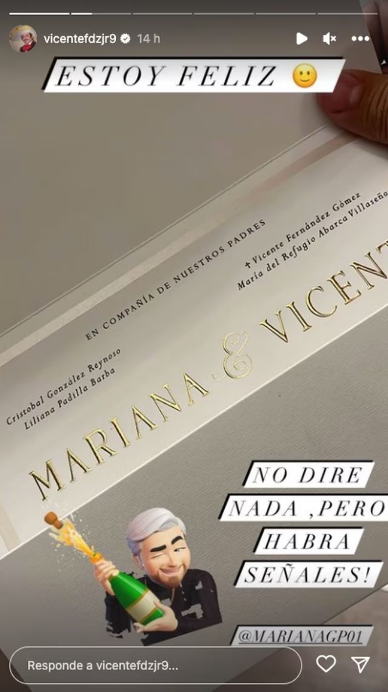 En la cabeza del mensaje se aprecian los nombres de los padres de los novios, incluyendo el de Vicente Fernández, quien falleció el 12 de diciembre de 2021, así que le colocaron una pequeña cruz para recordarlo, aunque el hijo de 'El Charro de Huentitán' no quiso mostrar demás y dejó picados a sus seguidores