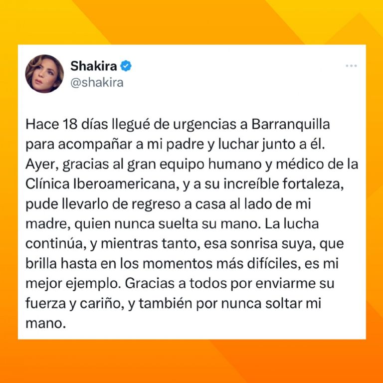 Algunas fuentes aseguran haber visto a Shakira muy al pendiente de Mebarak, de quien no se separó ni un minuto. Recientemente rompió el silencio acerca del difícil momento que vivió junto a su padre, pero del cual pudieron salir airosos gracias al "gran equipo humano y médico" de la Clínica Iberoamericana. Reconoció que la lucha continúa y, finalmente, agradeció a sus fans por los mensajes de apoyo que le enviaron.