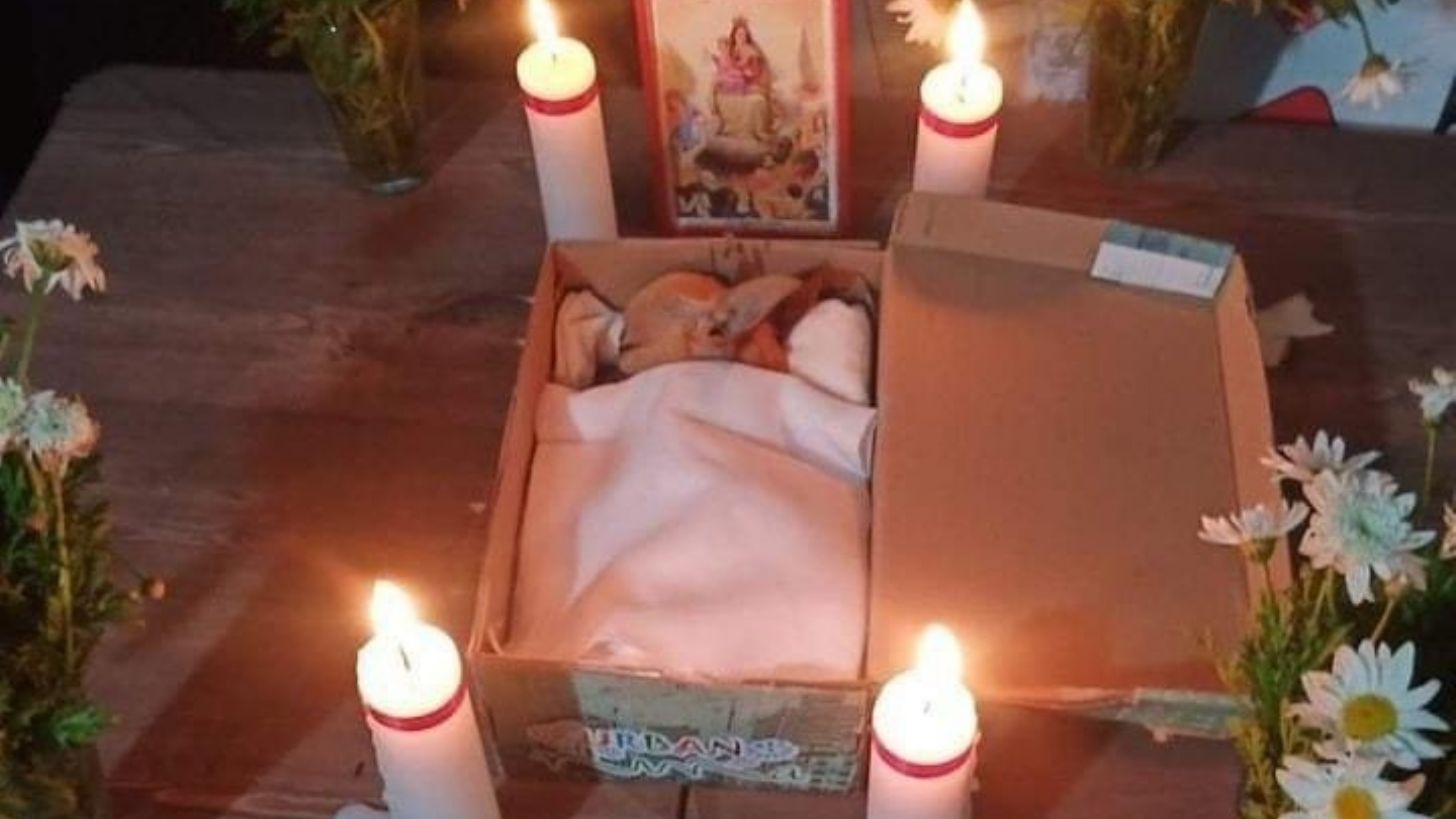 Para ello, acostaron a 'Ojitos' en una pequeña caja de cartón y lo cubrieron con una mantita blanca. En cada esquina colocaron velas blancas y en la parte superior dejaron la imagen de una virgen. Además, se pueden observar margaritas a un costado del can. Toda la familia se reunió para verlo por última vez.