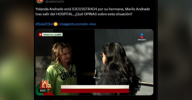 Pero ahora, en el programa de Sale el Sol, Infante una vez más ha dado informes de Yolanda, en el que aseguró que está "terminando de verificar" el hecho de que está incomunicada y encerrada en contra de su voluntad, afirmando que "personas muy cercanas" a la presentadora le están informando que la actriz de Rosa Salvaje "está viviendo un verdadero problema, pero con su propia familia".