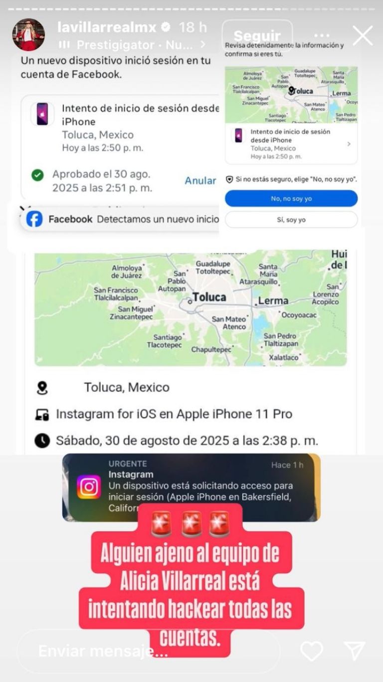 "Alguien ajeno al equipo de Alicia Villarreal está intentando hackear todas las cuentas", dice el escrito que aparece sobre una imagen donde se muestra que desde Toluca una persona quería invadir su perfil de Instagram. El hecho ocurrió el pasado sábado 30 de agosto alrededor de las 14:38 horas (tiempo local), y un poco más tarde la celebridad volvió a abordar el tema: "Gente sin qué hacer", afirmó.