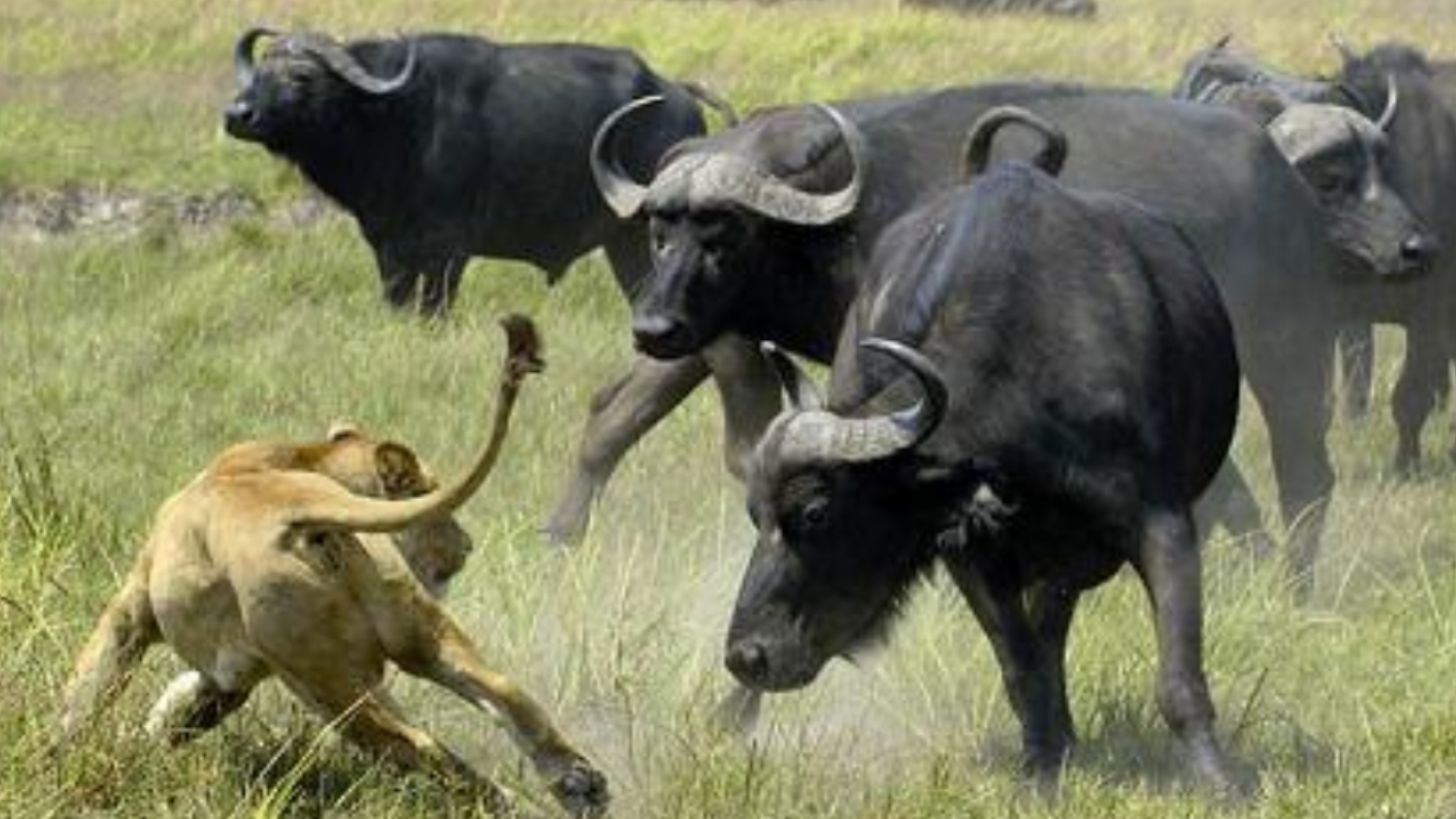 Ciudad de México.- Recientemente se ha viralizado el video captado por una turista en Sudáfrica, en el que se el impactante momento en el que se puede ver a una manada de búfalos que embisten ferozmente a una leona y la arrojan por los aires en varias ocasiones.