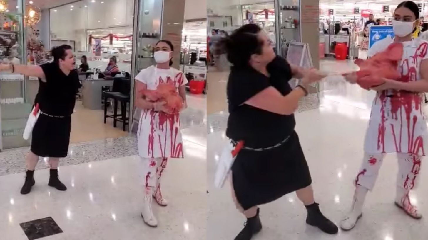 Perth, Australia.- En pleno centro comercial una mujer vegana y activista que lucha contra el abuso animal, se ha plantado en frente de una carnicería en Australia para gritar en contra de esto, haciendo que una carnicera saltara hacia en frente y comenzó una feroz pelea.