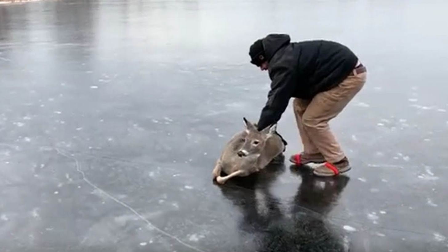 Al ver esto, un hombre decidió hacer algo al respecto, por lo que se acercó al animal para sacarlo de su fría prisión, a base de empujones guio al ciervo hasta la orilla, donde ya se pudo poner en sus cuatro patas y andar por si mismo.