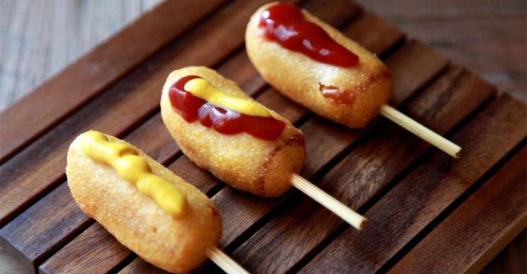 - Después se debe insertar un palito a la salchicha y sumergirlo en la masa hasta que esté totalmente bañado.