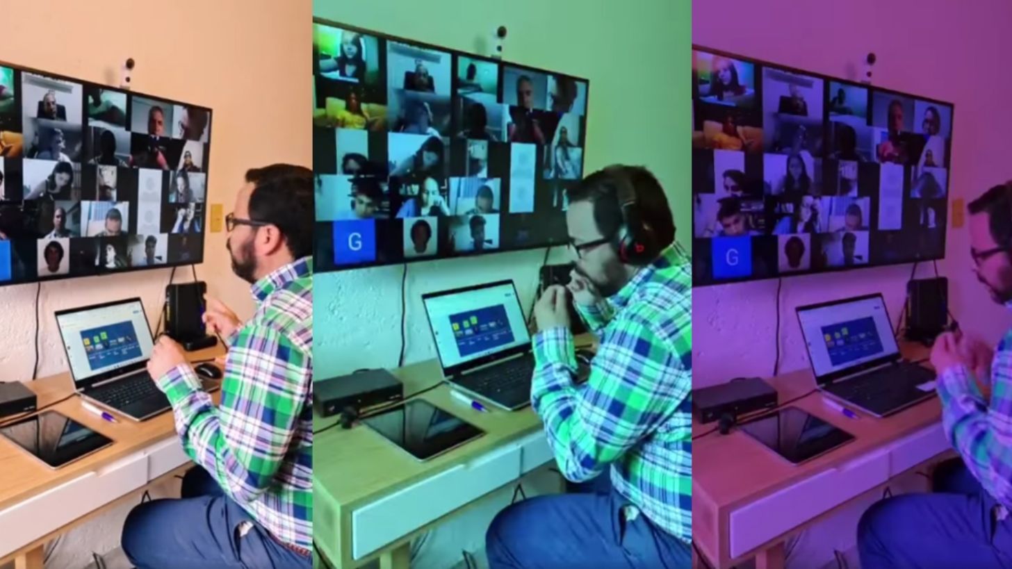 En este video se puede ver a Rodrigo mientras está sentado frente a su computadora y un gran televisor en el que puede observar a los estudiantes, mientras que va comenzando las clases y les manda saludos.