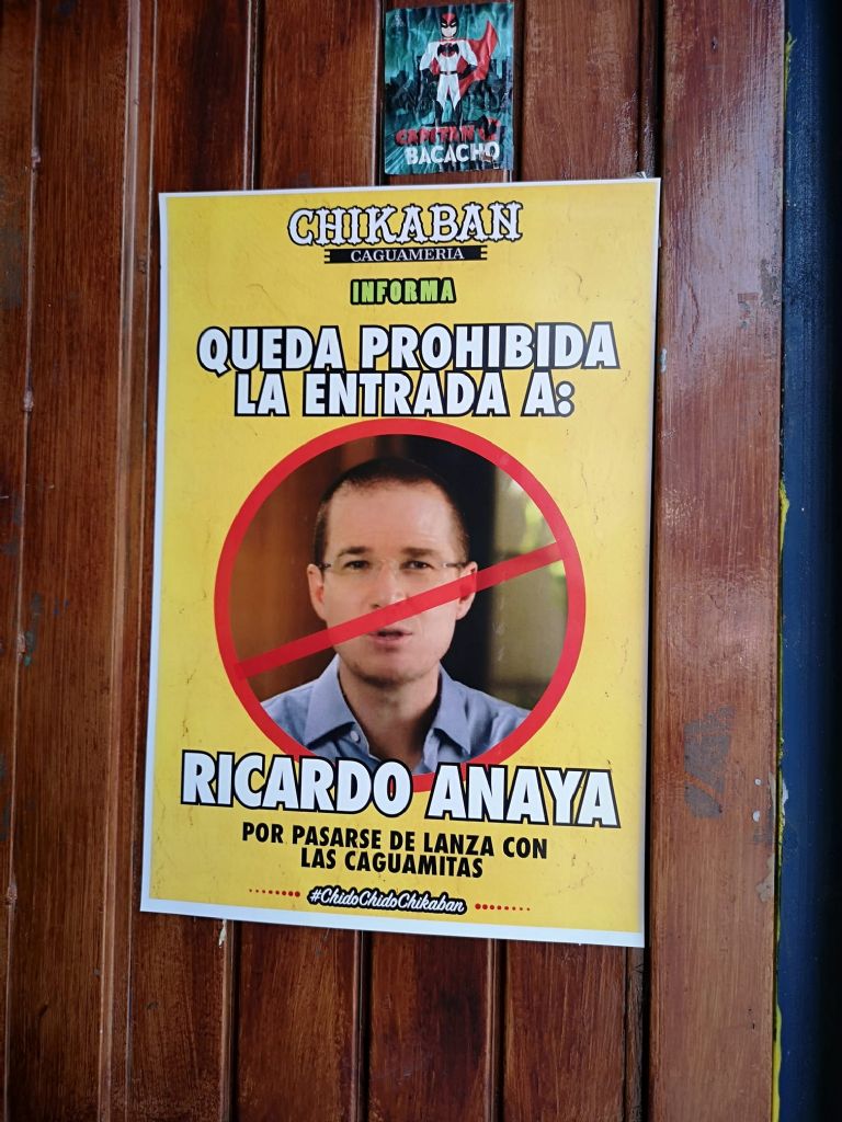 En la entrada del local luce un letrero en color amarillo que informa: "Queda prohibida la entrada a Ricardo Anaya por pasarse de lanza con las caguamitas". Asimismo, exhibe el rostro del excandidato a la presidencia encerrado en una bolaspa.