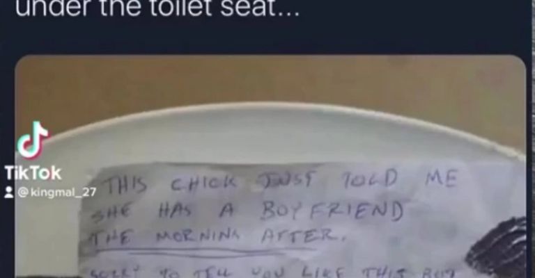 Debajo del asiento del inodoro, esa fue la zona privilegiada que por fuerza debía ser vista por el novio. En efecto, así ocurrió y en el papel leyó: "Esta chica me acaba de decir que tiene novio esta mañana. Siento decírtelo así, pero yo en tu lugar querría saberlo. Lo siento hermano".